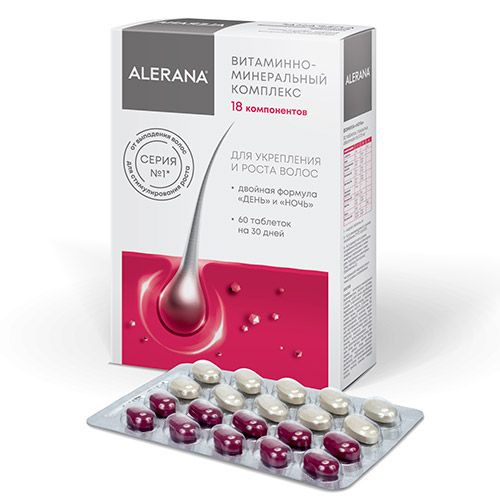 Витаминно-минеральный комплекс ALERANA® содержит 18 активных элементов, которые разделены на формулы «День» и «Ночь» с учетом суточного ритма роста волос и совместимости компонентов – это обеспечивает волосяные фолликулы витаминами и минералами, необходимыми для роста здоровых волос. В этом комплексе формула «День» содержит магний, железо, селен, фолиевую кислоту, а также бета-каротин и витамины С, E, и B1. В состав формулы «Ночь» входят витамины группы B - B2, B6, B12, а также такие микроэлементы, как цистин, цинк, кальция D-пантотенат, витамин D3, кремний, биотин и хром. Эти компоненты оздоравливают и укрепляют волосы за счет улучшения питания луковиц и восполнения недостаточного уровня микроэлементов, участвующих в формировании волосяного стержня.