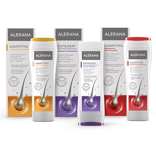 Линейка ALERANA® включает в себя 12 средств (шампуни и бальзамы) – это позволяет легко подобрать индивидуальную схему ухода и восстановления волос каждому пациенту.